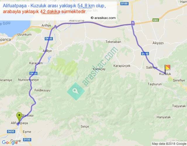 Alifuatpaşa - Kuzuluk arası yaklaşık olarak 90 km/h ile yukarıda belirtilen sürede olup, iki yerin kuş uçuşu uzaklığı (mesafesi) 30'dir. Yolculuk otobüsle 54 dakika sürmektedir.