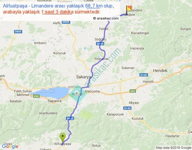 Alifuatpaşa - Limandere arası yaklaşık olarak 90 km/h ile yukarıda belirtilen sürede olup, iki yerin kuş uçuşu uzaklığı (mesafesi) 55'dir. Yolculuk otobüsle 1 saat 21 dakika sürmektedir.