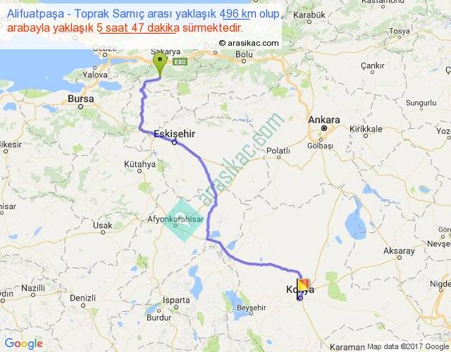 Alifuatpaşa - Toprak Sarnıç arası yaklaşık olarak 90 km/h ile yukarıda belirtilen sürede olup, iki yerin kuş uçuşu uzaklığı (mesafesi) 350'dir. Eğer belirtilen yerler arasında uçak seferi var ise bu süre uçakla 32 dakika'ya kadar düşebilir. Yolculuk otobüsle 7 saat 31 dakika sürmektedir.
