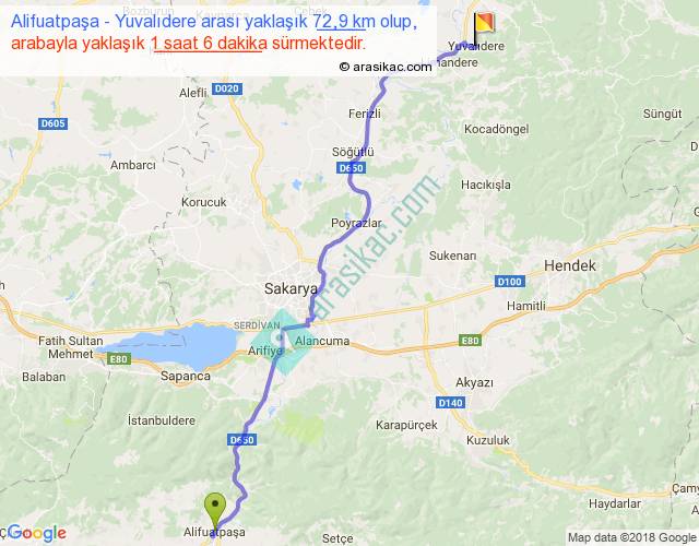 Alifuatpaşa - Yuvalıdere arası yaklaşık olarak 90 km/h ile yukarıda belirtilen sürede olup, iki yerin kuş uçuşu uzaklığı (mesafesi) 58'dir. Yolculuk otobüsle 1 saat 25 dakika sürmektedir.