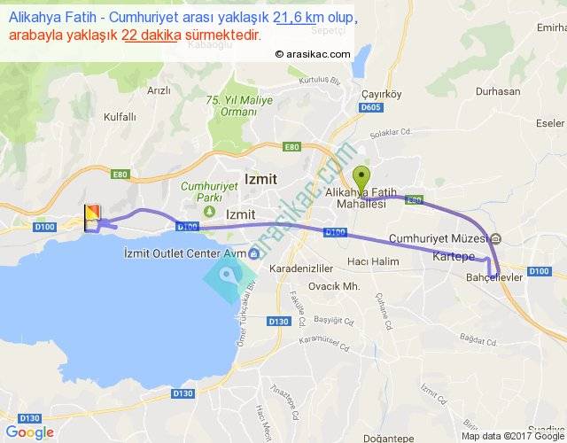 Alikahya Fatih - Cumhuriyet arası yaklaşık olarak 90 km/h ile yukarıda belirtilen sürede olup, iki yerin kuş uçuşu uzaklığı (mesafesi) 9'dir. Yolculuk otobüsle 28 dakika sürmektedir.