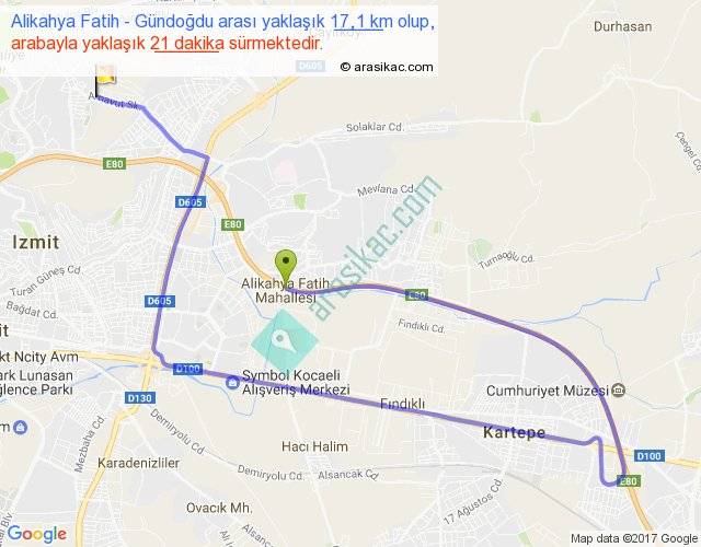 Alikahya Fatih - Gündoğdu arası yaklaşık olarak 90 km/h ile yukarıda belirtilen sürede olup, iki yerin kuş uçuşu uzaklığı (mesafesi) 4'dir. Yolculuk otobüsle 27 dakika sürmektedir.