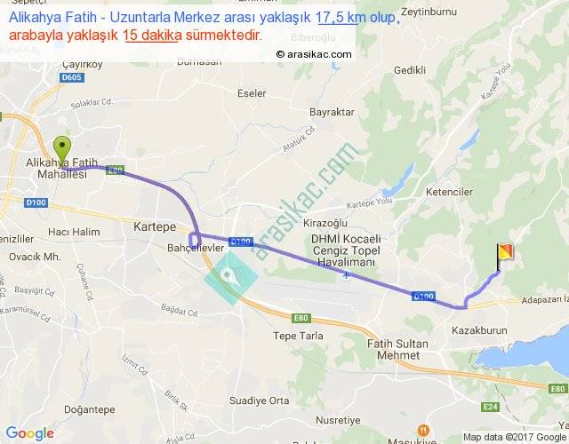 Alikahya Fatih - Uzuntarla Merkez arası yaklaşık olarak 90 km/h ile yukarıda belirtilen sürede olup, iki yerin kuş uçuşu uzaklığı (mesafesi) 14'dir. Yolculuk otobüsle 19 dakika sürmektedir.