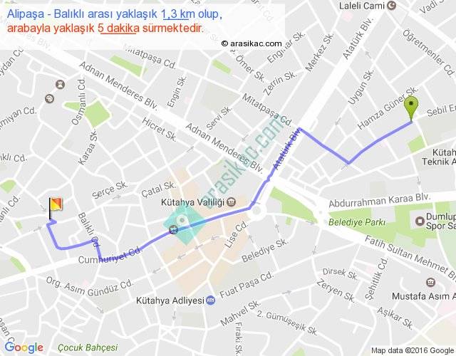 Alipaşa - Balıklı arası yaklaşık olarak 90 km/h ile yukarıda belirtilen sürede olup, iki yerin kuş uçuşu uzaklığı (mesafesi) 1'dir. Yolculuk otobüsle 6 dakika sürmektedir.