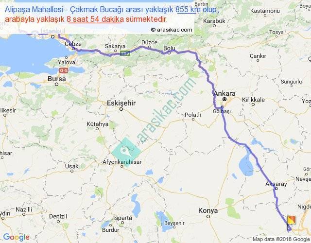 Alipaşa Mahallesi - Çakmak Bucağı arası yaklaşık olarak 90 km/h ile yukarıda belirtilen sürede olup, iki yerin kuş uçuşu uzaklığı (mesafesi) 647'dir. Eğer belirtilen yerler arasında uçak seferi var ise bu süre uçakla 59 dakika'ya kadar düşebilir. Yolculuk otobüsle 11 saat 34 dakika sürmektedir.