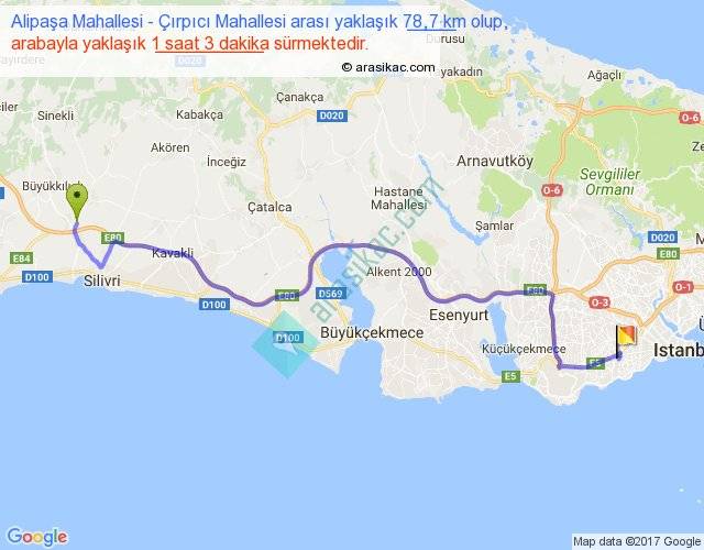 Alipaşa Mahallesi - Çırpıcı Mahallesi arası yaklaşık olarak 90 km/h ile yukarıda belirtilen sürede olup, iki yerin kuş uçuşu uzaklığı (mesafesi) 58'dir. Yolculuk otobüsle 1 saat 21 dakika sürmektedir.