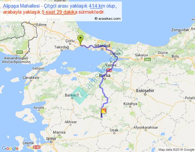 Alipaşa Mahallesi - Çitgöl arası yaklaşık olarak 90 km/h ile yukarıda belirtilen sürede olup, iki yerin kuş uçuşu uzaklığı (mesafesi) 228'dir. Yolculuk otobüsle 7 saat 7 dakika sürmektedir.