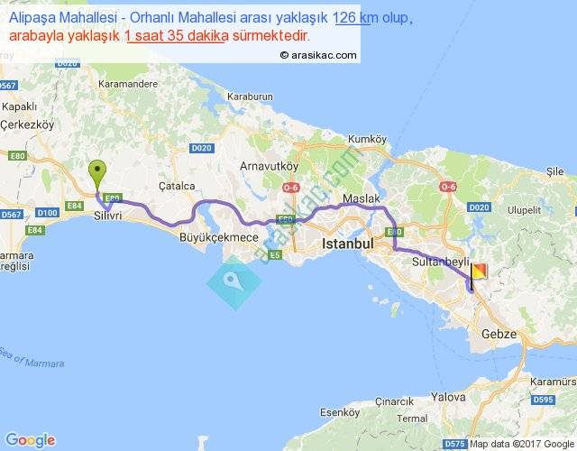 Alipaşa Mahallesi - Orhanlı Mahallesi arası yaklaşık olarak 90 km/h ile yukarıda belirtilen sürede olup, iki yerin kuş uçuşu uzaklığı (mesafesi) 98'dir. Yolculuk otobüsle 2 saat 3 dakika sürmektedir.