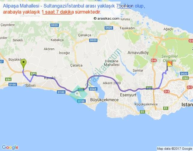 Alipaşa Mahallesi - Sultangazi İstanbul arası yaklaşık olarak 90 km/h ile yukarıda belirtilen sürede olup, iki yerin kuş uçuşu uzaklığı (mesafesi) 55'dir. Yolculuk otobüsle 1 saat 27 dakika sürmektedir.