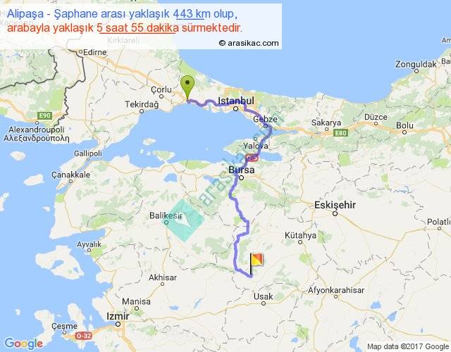 Alipaşa - Şaphane arası yaklaşık olarak 90 km/h ile yukarıda belirtilen sürede olup, iki yerin kuş uçuşu uzaklığı (mesafesi) 245'dir. Yolculuk otobüsle 7 saat 41 dakika sürmektedir.