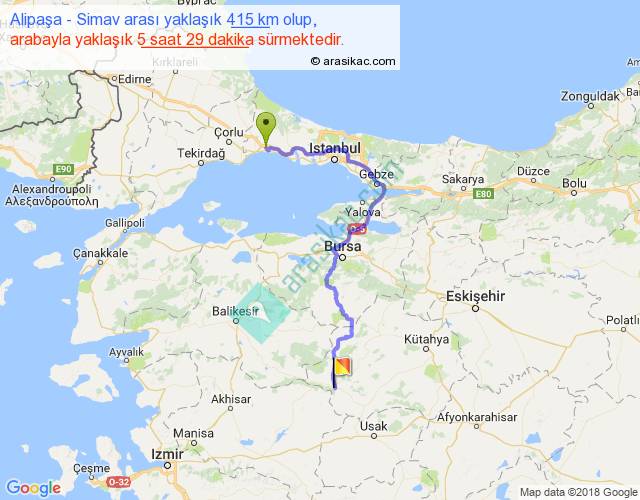 Alipaşa - Simav arası yaklaşık olarak 90 km/h ile yukarıda belirtilen sürede olup, iki yerin kuş uçuşu uzaklığı (mesafesi) 232'dir. Yolculuk otobüsle 7 saat 7 dakika sürmektedir.
