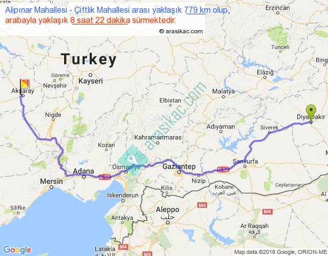 Alipınar Mahallesi - Çiftlik Mahallesi arası yaklaşık olarak 90 km/h ile yukarıda belirtilen sürede olup, iki yerin kuş uçuşu uzaklığı (mesafesi) 543'dir. Eğer belirtilen yerler arasında uçak seferi var ise bu süre uçakla 50 dakika'ya kadar düşebilir. Yolculuk otobüsle 10 saat 52 dakika sürmektedir.