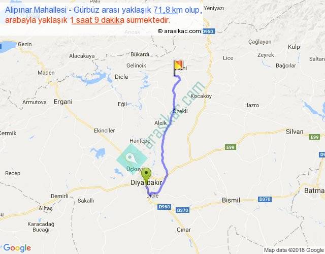 Alipınar Mahallesi - Gürbüz arası yaklaşık olarak 90 km/h ile yukarıda belirtilen sürede olup, iki yerin kuş uçuşu uzaklığı (mesafesi) 54'dir. Yolculuk otobüsle 1 saat 29 dakika sürmektedir.