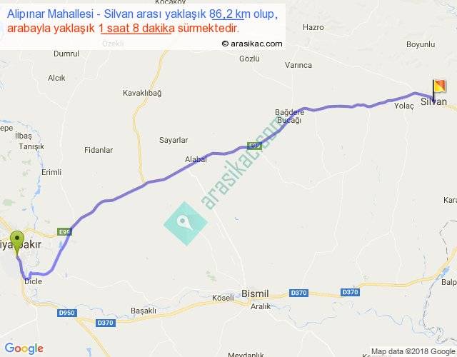 Alipınar Mahallesi - Silvan arası yaklaşık olarak 90 km/h ile yukarıda belirtilen sürede olup, iki yerin kuş uçuşu uzaklığı (mesafesi) 74'dir. Yolculuk otobüsle 1 saat 28 dakika sürmektedir.