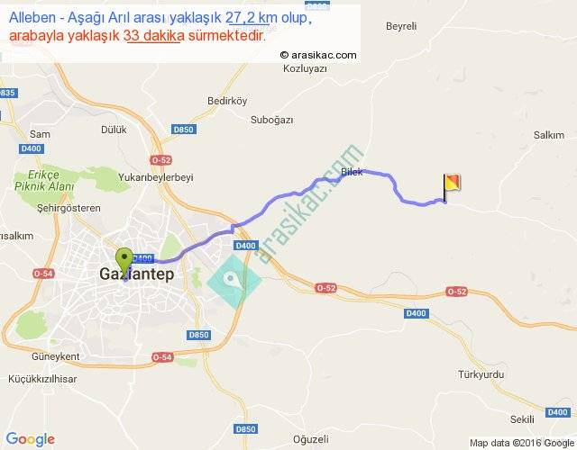 Alleben - Aşağı Arıl arası yaklaşık olarak 90 km/h ile yukarıda belirtilen sürede olup, iki yerin kuş uçuşu uzaklığı (mesafesi) 22'dir. Yolculuk otobüsle 42 dakika sürmektedir.