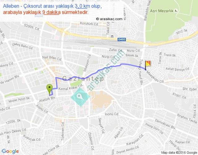 Alleben - Çıksorut arası yaklaşık olarak 90 km/h ile yukarıda belirtilen sürede olup, iki yerin kuş uçuşu uzaklığı (mesafesi) 2'dir. Yolculuk otobüsle 11 dakika sürmektedir.