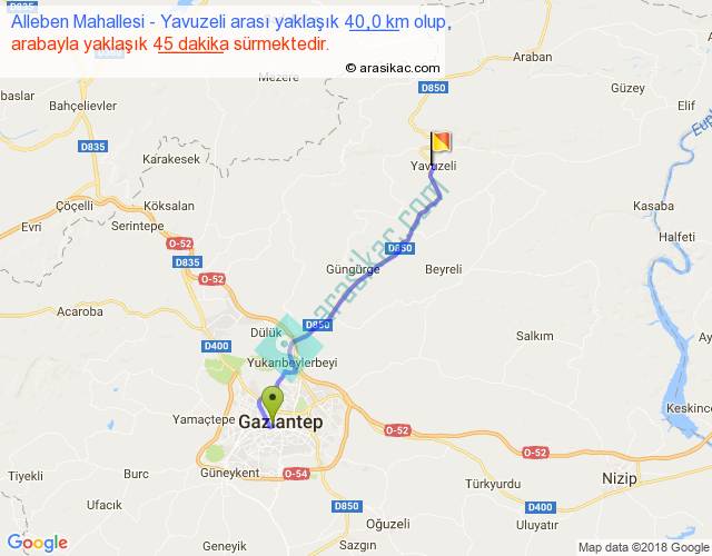 Alleben Mahallesi - Yavuzeli arası yaklaşık olarak 90 km/h ile yukarıda belirtilen sürede olup, iki yerin kuş uçuşu uzaklığı (mesafesi) 33'dir. Yolculuk otobüsle 58 dakika sürmektedir.