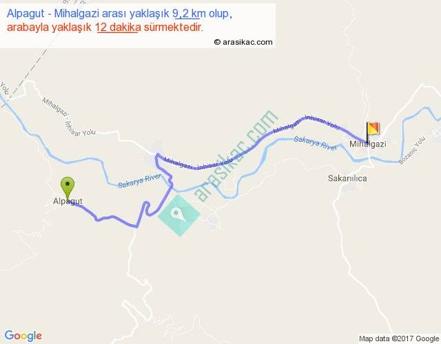Alpagut - Mihalgazi arası yaklaşık olarak 90 km/h ile yukarıda belirtilen sürede olup, iki yerin kuş uçuşu uzaklığı (mesafesi) 6'dir. Yolculuk otobüsle 15 dakika sürmektedir.