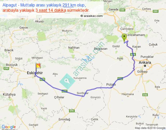 Alpagut - Muttalip arası yaklaşık olarak 90 km/h ile yukarıda belirtilen sürede olup, iki yerin kuş uçuşu uzaklığı (mesafesi) 166'dir. Yolculuk otobüsle 4 saat 12 dakika sürmektedir.