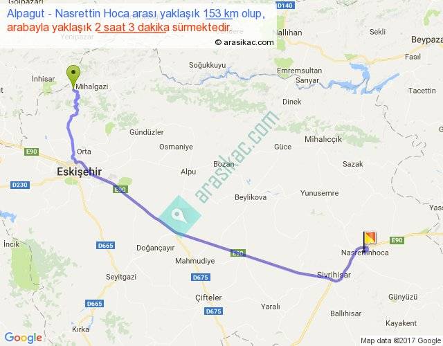 Alpagut - Nasrettin Hoca arası yaklaşık olarak 90 km/h ile yukarıda belirtilen sürede olup, iki yerin kuş uçuşu uzaklığı (mesafesi) 113'dir. Yolculuk otobüsle 2 saat 39 dakika sürmektedir.