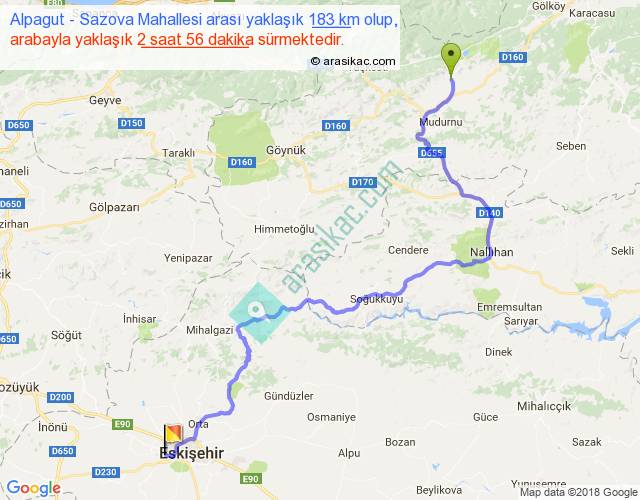 Alpagut - Sazova Mahallesi arası yaklaşık olarak 90 km/h ile yukarıda belirtilen sürede olup, iki yerin kuş uçuşu uzaklığı (mesafesi) 109'dir. Yolculuk otobüsle 3 saat 48 dakika sürmektedir.