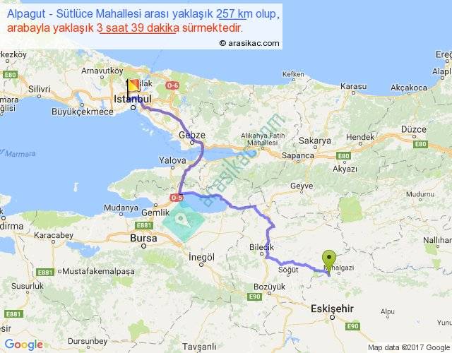 Alpagut - Sütlüce Mahallesi arası yaklaşık olarak 90 km/h ile yukarıda belirtilen sürede olup, iki yerin kuş uçuşu uzaklığı (mesafesi) 174'dir. Yolculuk otobüsle 4 saat 44 dakika sürmektedir.