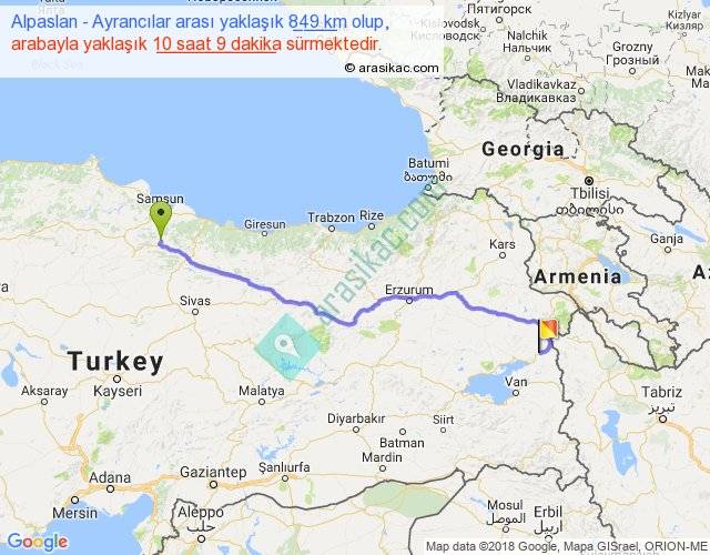 Alpaslan - Ayrancılar arası yaklaşık olarak 90 km/h ile yukarıda belirtilen sürede olup, iki yerin kuş uçuşu uzaklığı (mesafesi) 664'dir. Eğer belirtilen yerler arasında uçak seferi var ise bu süre uçakla 1 saat 01 dakika'ya kadar düşebilir. Yolculuk otobüsle 13 saat 11 dakika sürmektedir.