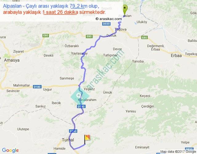 Alpaslan - Çaylı arası yaklaşık olarak 90 km/h ile yukarıda belirtilen sürede olup, iki yerin kuş uçuşu uzaklığı (mesafesi) 50'dir. Yolculuk otobüsle 1 saat 51 dakika sürmektedir.