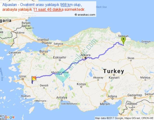 Alpaslan - Ovakent arası yaklaşık olarak 90 km/h ile yukarıda belirtilen sürede olup, iki yerin kuş uçuşu uzaklığı (mesafesi) 770'dir. Eğer belirtilen yerler arasında uçak seferi var ise bu süre uçakla 1 saat 11 dakika'ya kadar düşebilir. Yolculuk otobüsle 15 saat 17 dakika sürmektedir.