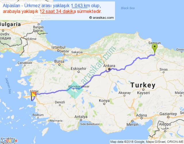 Alpaslan - Ürkmez arası yaklaşık olarak 90 km/h ile yukarıda belirtilen sürede olup, iki yerin kuş uçuşu uzaklığı (mesafesi) 858'dir. Eğer belirtilen yerler arasında uçak seferi var ise bu süre uçakla 1 saat 19 dakika'ya kadar düşebilir. Yolculuk otobüsle 16 saat 20 dakika sürmektedir.