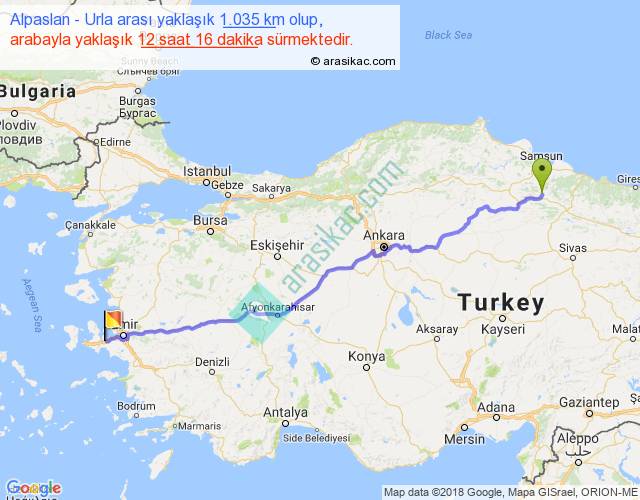 Alpaslan - Urla arası yaklaşık olarak 90 km/h ile yukarıda belirtilen sürede olup, iki yerin kuş uçuşu uzaklığı (mesafesi) 860'dir. Eğer belirtilen yerler arasında uçak seferi var ise bu süre uçakla 1 saat 19 dakika'ya kadar düşebilir. Yolculuk otobüsle 15 saat 56 dakika sürmektedir.