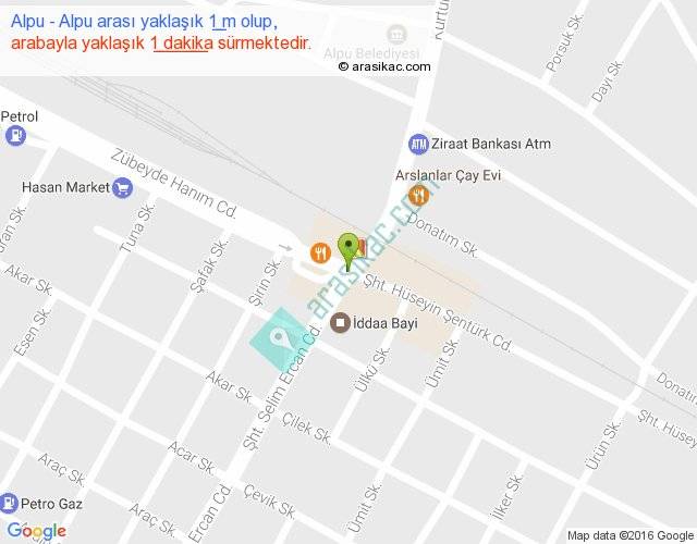 Alpu - Alpu arası yaklaşık olarak 90 km/h ile yukarıda belirtilen sürede olup, iki yerin kuş uçuşu uzaklığı (mesafesi) 0'dir. Yolculuk otobüsle 1 dakika sürmektedir.