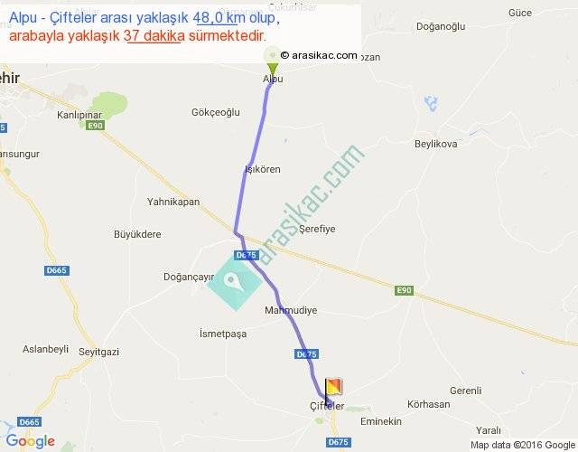 Alpu - Çifteler arası yaklaşık olarak 90 km/h ile yukarıda belirtilen sürede olup, iki yerin kuş uçuşu uzaklığı (mesafesi) 43'dir. Yolculuk otobüsle 48 dakika sürmektedir.