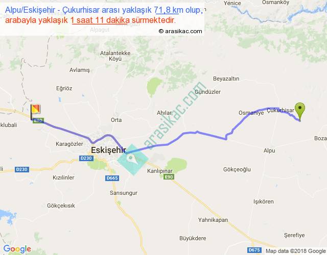 Alpu Eskişehir - Çukurhisar arası yaklaşık olarak 90 km/h ile yukarıda belirtilen sürede olup, iki yerin kuş uçuşu uzaklığı (mesafesi) 61'dir. Yolculuk otobüsle 1 saat 32 dakika sürmektedir.