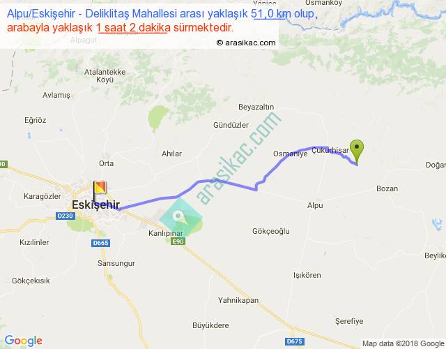 Alpu Eskişehir - Deliklitaş Mahallesi arası yaklaşık olarak 90 km/h ile yukarıda belirtilen sürede olup, iki yerin kuş uçuşu uzaklığı (mesafesi) 44'dir. Yolculuk otobüsle 1 saat 20 dakika sürmektedir.