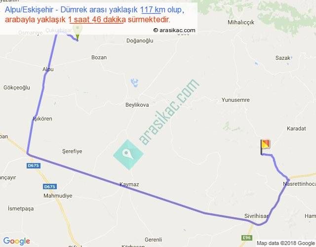 Alpu Eskişehir - Dümrek arası yaklaşık olarak 90 km/h ile yukarıda belirtilen sürede olup, iki yerin kuş uçuşu uzaklığı (mesafesi) 51'dir. Yolculuk otobüsle 2 saat 17 dakika sürmektedir.