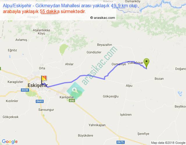 Alpu Eskişehir - Gökmeydan Mahallesi arası yaklaşık olarak 90 km/h ile yukarıda belirtilen sürede olup, iki yerin kuş uçuşu uzaklığı (mesafesi) 42'dir. Yolculuk otobüsle 1 saat 11 dakika sürmektedir.