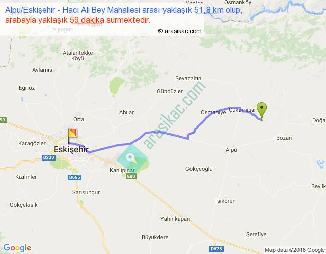 Alpu Eskişehir - Hacı Ali Bey Mahallesi arası yaklaşık olarak 90 km/h ile yukarıda belirtilen sürede olup, iki yerin kuş uçuşu uzaklığı (mesafesi) 44'dir. Yolculuk otobüsle 1 saat 16 dakika sürmektedir.