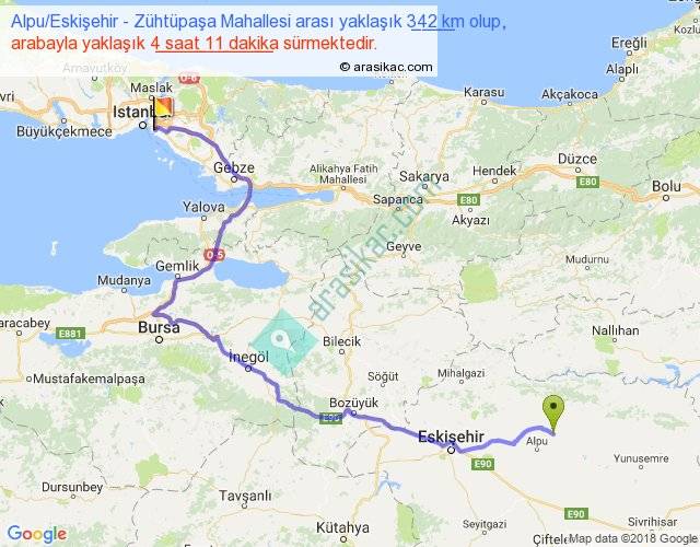 Alpu Eskişehir - Zühtüpaşa Mahallesi arası yaklaşık olarak 90 km/h ile yukarıda belirtilen sürede olup, iki yerin kuş uçuşu uzaklığı (mesafesi) 212'dir. Yolculuk otobüsle 5 saat 26 dakika sürmektedir.