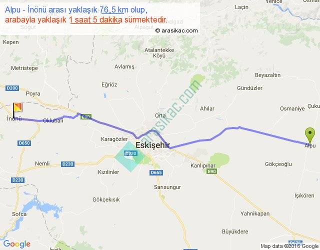Alpu - İnönü arası yaklaşık olarak 90 km/h ile yukarıda belirtilen sürede olup, iki yerin kuş uçuşu uzaklığı (mesafesi) 69'dir. Yolculuk otobüsle 1 saat 24 dakika sürmektedir.