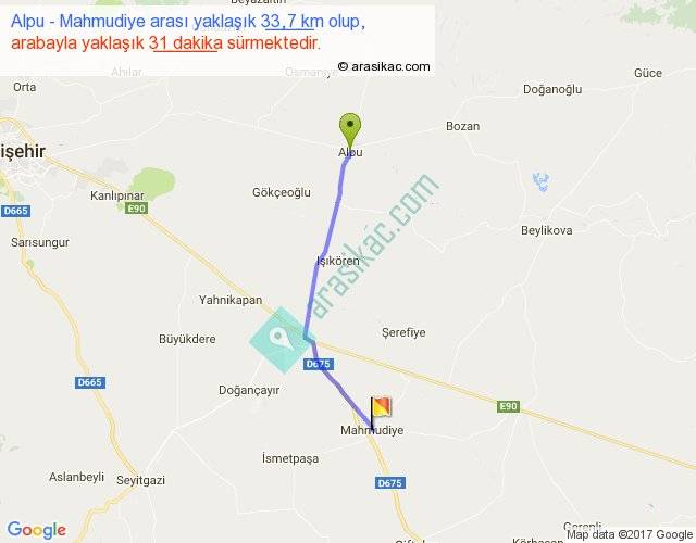 Alpu - Mahmudiye arası yaklaşık olarak 90 km/h ile yukarıda belirtilen sürede olup, iki yerin kuş uçuşu uzaklığı (mesafesi) 30'dir. Yolculuk otobüsle 40 dakika sürmektedir.