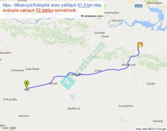 Alpu - Mihalıcçık Eskişehir arası yaklaşık olarak 90 km/h ile yukarıda belirtilen sürede olup, iki yerin kuş uçuşu uzaklığı (mesafesi) 53'dir. Yolculuk otobüsle 1 saat 8 dakika sürmektedir.