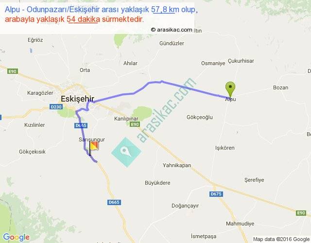 Alpu - Odunpazarı Eskişehir arası yaklaşık olarak 90 km/h ile yukarıda belirtilen sürede olup, iki yerin kuş uçuşu uzaklığı (mesafesi) 36'dir. Yolculuk otobüsle 1 saat 10 dakika sürmektedir.