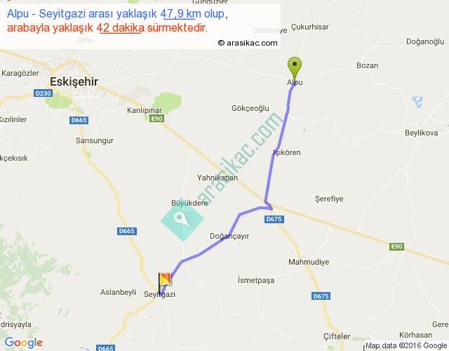 Alpu - Seyitgazi arası yaklaşık olarak 90 km/h ile yukarıda belirtilen sürede olup, iki yerin kuş uçuşu uzaklığı (mesafesi) 42'dir. Yolculuk otobüsle 54 dakika sürmektedir.