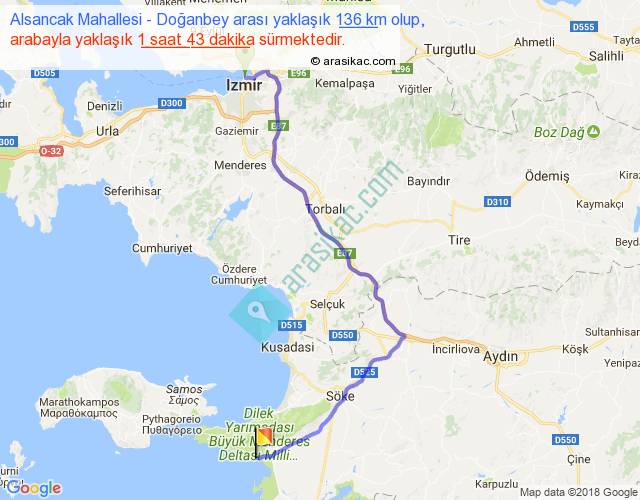 Alsancak Mahallesi - Doğanbey arası yaklaşık olarak 90 km/h ile yukarıda belirtilen sürede olup, iki yerin kuş uçuşu uzaklığı (mesafesi) 91'dir. Yolculuk otobüsle 2 saat 13 dakika sürmektedir.
