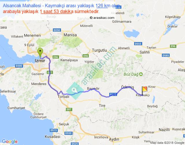 Alsancak Mahallesi - Kaymakçi arası yaklaşık olarak 90 km/h ile yukarıda belirtilen sürede olup, iki yerin kuş uçuşu uzaklığı (mesafesi) 90'dir. Yolculuk otobüsle 2 saat 26 dakika sürmektedir.