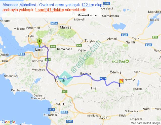 Alsancak Mahallesi - Ovakent arası yaklaşık olarak 90 km/h ile yukarıda belirtilen sürede olup, iki yerin kuş uçuşu uzaklığı (mesafesi) 84'dir. Yolculuk otobüsle 2 saat 11 dakika sürmektedir.