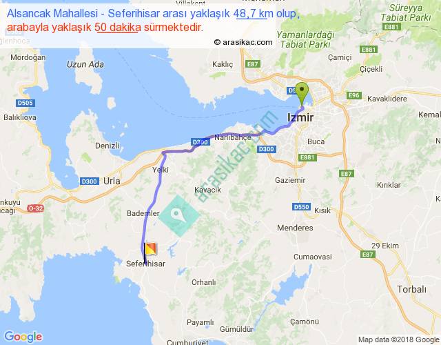 Alsancak Mahallesi - Seferihisar arası yaklaşık olarak 90 km/h ile yukarıda belirtilen sürede olup, iki yerin kuş uçuşu uzaklığı (mesafesi) 38'dir. Yolculuk otobüsle 1 saat 5 dakika sürmektedir.