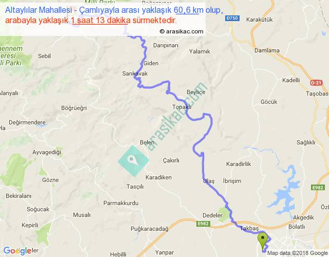 Altaylılar Mahallesi - Çamlıyayla arası yaklaşık olarak 90 km/h ile yukarıda belirtilen sürede olup, iki yerin kuş uçuşu uzaklığı (mesafesi) 35'dir. Yolculuk otobüsle 1 saat 34 dakika sürmektedir.