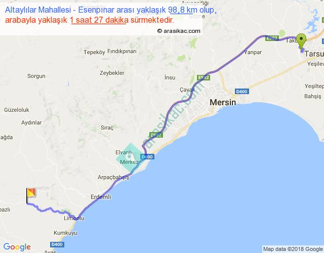 Altaylılar Mahallesi - Esenpınar arası yaklaşık olarak 90 km/h ile yukarıda belirtilen sürede olup, iki yerin kuş uçuşu uzaklığı (mesafesi) 75'dir. Yolculuk otobüsle 1 saat 53 dakika sürmektedir.